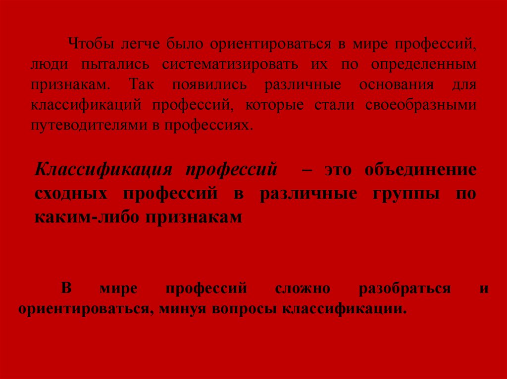 Чтобы легче было ориентироваться в мире профессий,люди пытались систематизировать их по определенным