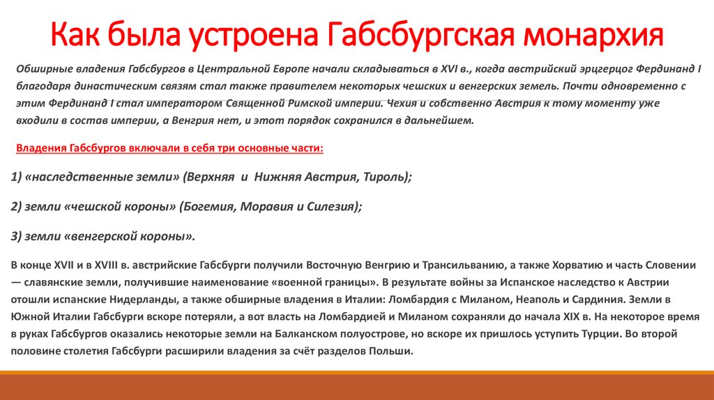 Обширные владения Габсбургов в Центральной Европе начали складываться в XVI в., когда австрийский эрцгерцог Фердинанд Iблагодаря династическим связям стал также правителем некоторых чешских и венгерских земель. Почти одновременно с