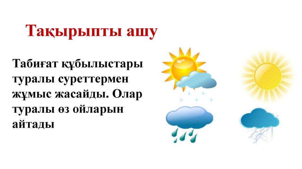найзағай, жаңбыр, қар, бұршақ, жел.