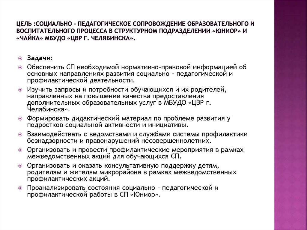 2. Цель :социально - педагогическое сопровождение образовательного и воспитательного процесса в структурном подразделении «Юниор»