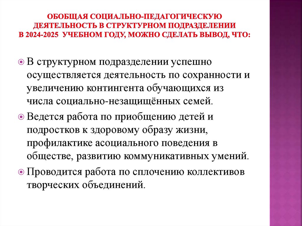 15. Обобщая социально-педагогическую деятельность в структурном подразделении в 2024-2025 учебном году, можно сделать вывод, что: