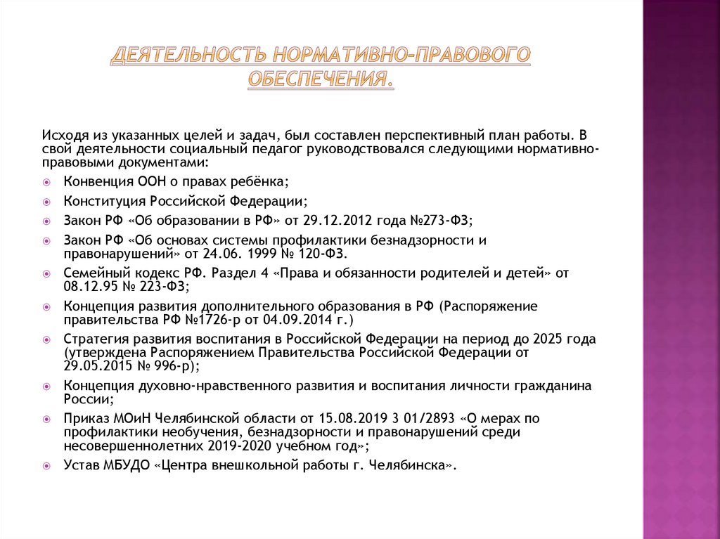Исходя из указанных целей и задач, был составлен перспективный план работы. Всвой деятельности социальный педагог руководствовался следующими нормативноправовыми документами:
