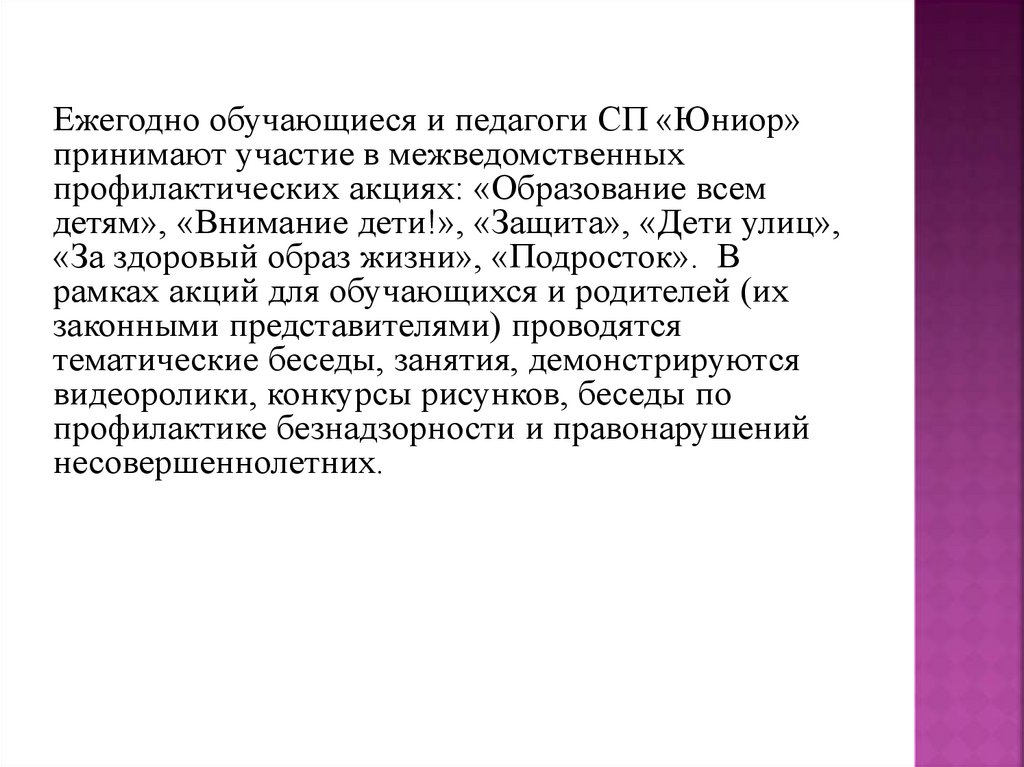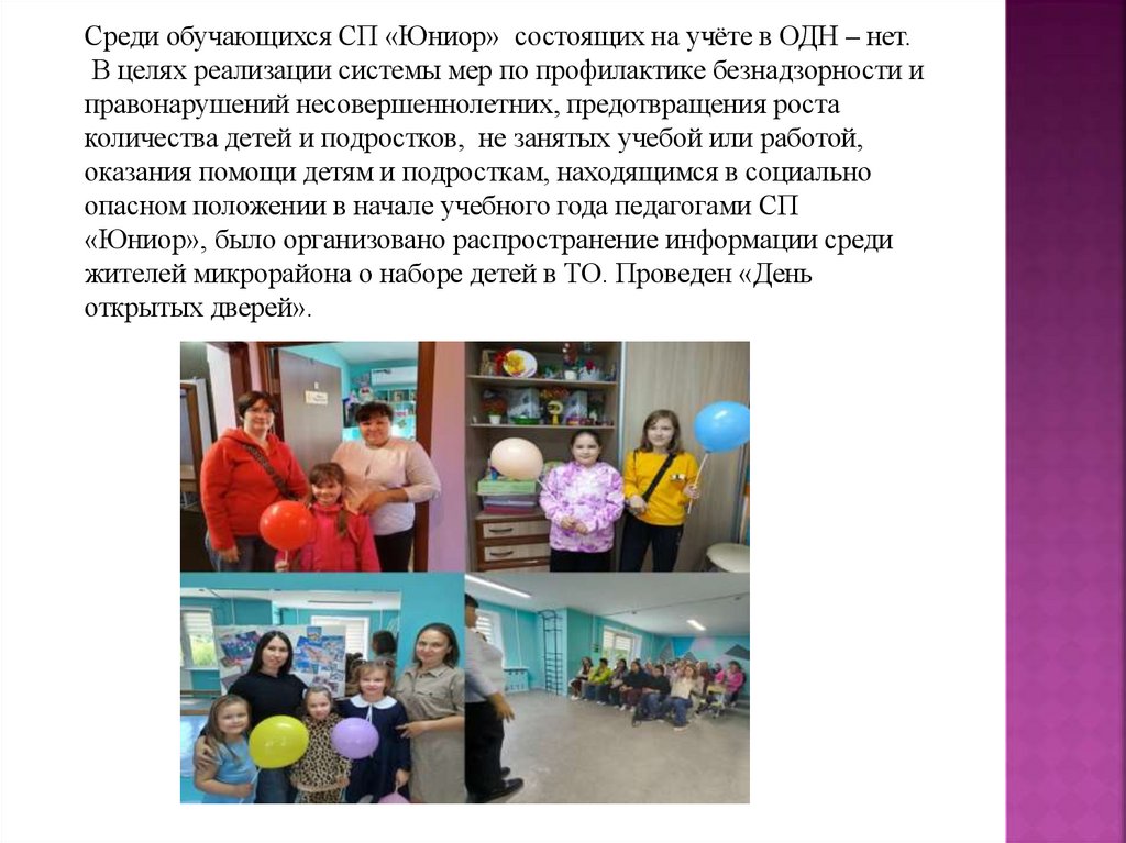 Среди обучающихся СП «Юниор» состоящих на учёте в ОДН – нет.В целях реализации системы мер по профилактике безнадзорности и