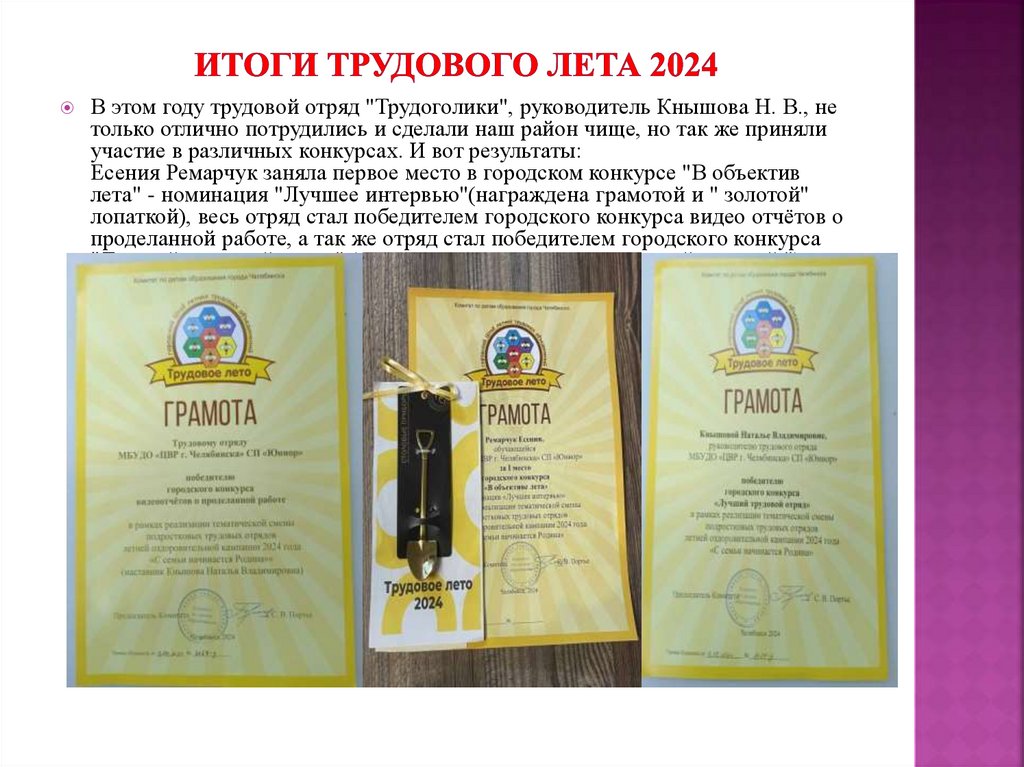 "Лучший трудовой отряд" (награждены грамотами и "золотой лопатой ").