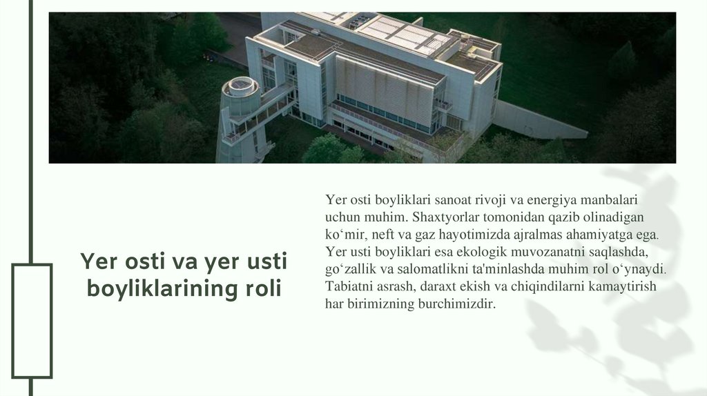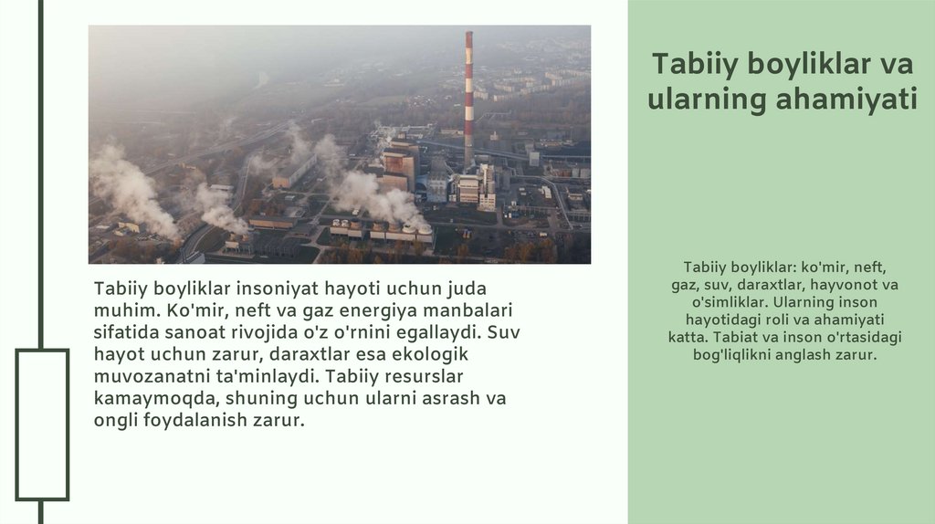 tabiiy resurslardir: - O‘rmonlar: havo tozaligi va ekosistemani