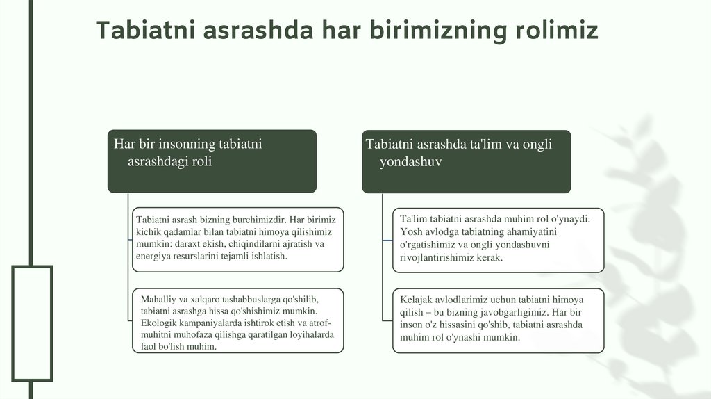 asrash va kelajak avlodlarga toza, sog'lom muhit qoldirish