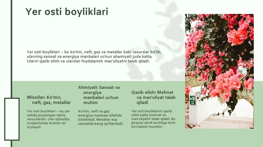 Yer osti boyliklari – bu ko‘mir, neft, gaz va metallar kabi resurslar bo‘lib,ularning sanoat va energiya manbalari uchun ahamiyati juda katta.