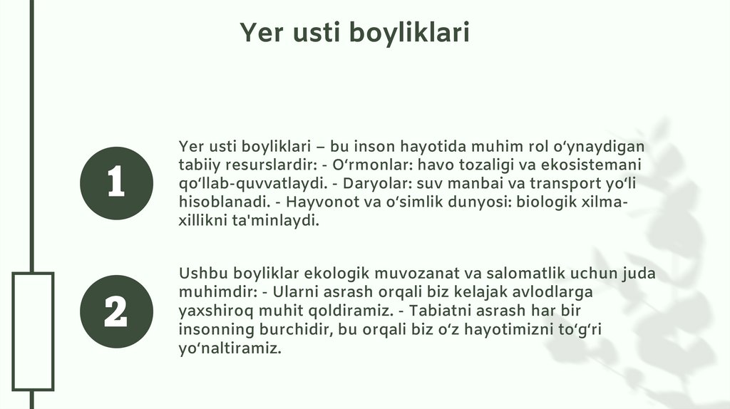 Yer usti boyliklari esa ekologik muvozanatni saqlashda,