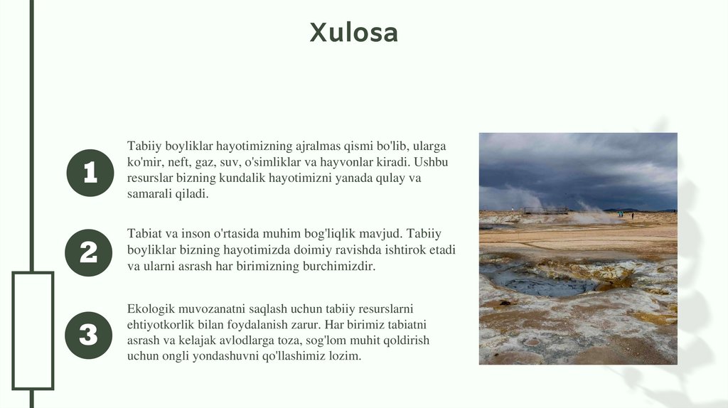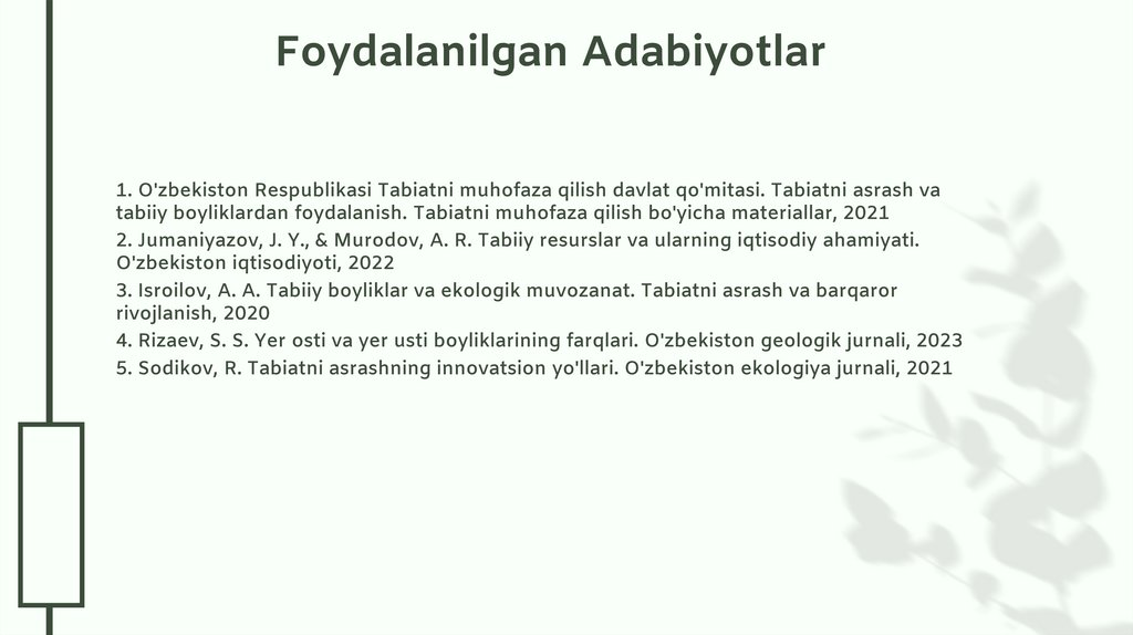 2. Jumaniyazov, J. Y., & Murodov, A. R. Tabiiy resurslar va ularning iqtisodiy ahamiyati.