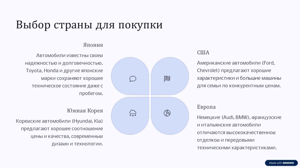 Японские автомобили известны надежностью, американские хорошими характеристиками, европейские - высококачественной