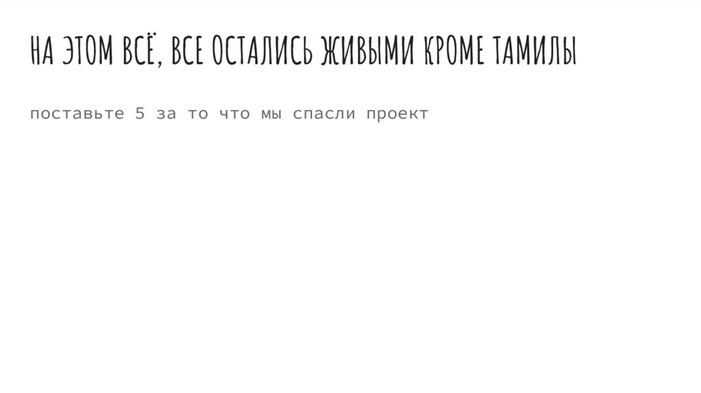 НА ЭТОМ ВСЁ, ВСЕ ОСТАЛИСЬ ЖИВЫМИ КРОМЕ ТАМИЛЫпоставьте 5 за то что мы спасли проект