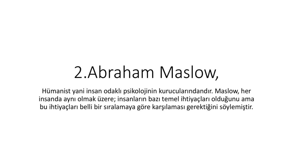 Hümanist yani insan odaklı psikolojinin kurucularındandır. Maslow, herinsanda aynı olmak üzere; insanların bazı temel ihtiyaçları olduğunu ama