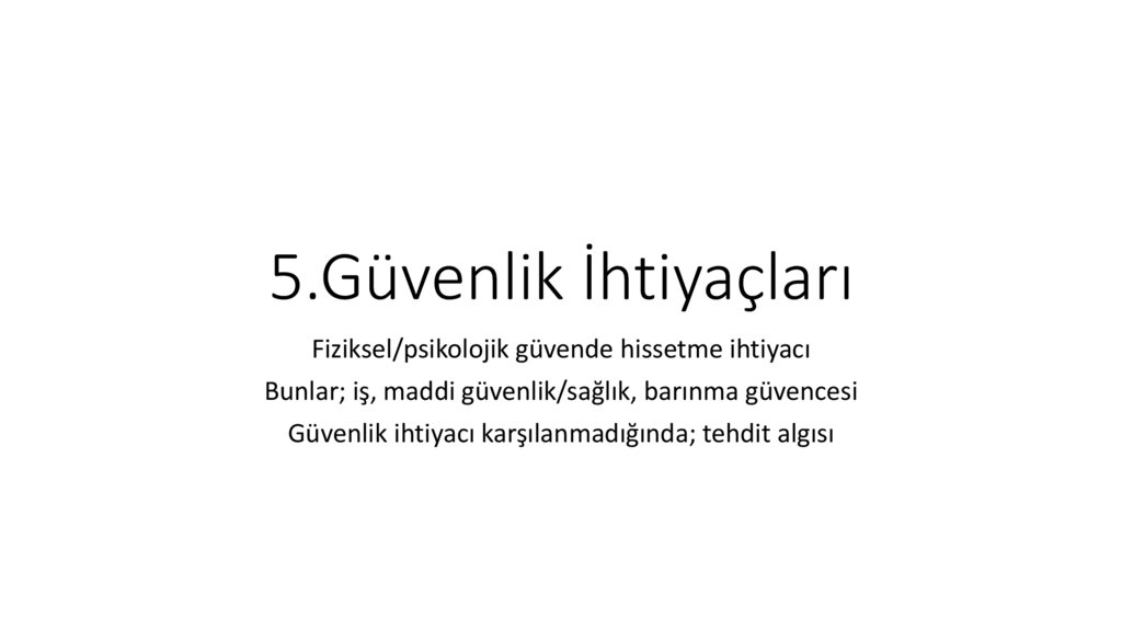 Fiziksel/psikolojik güvende hissetme ihtiyacıBunlar; iş, maddi güvenlik/sağlık, barınma güvencesi
