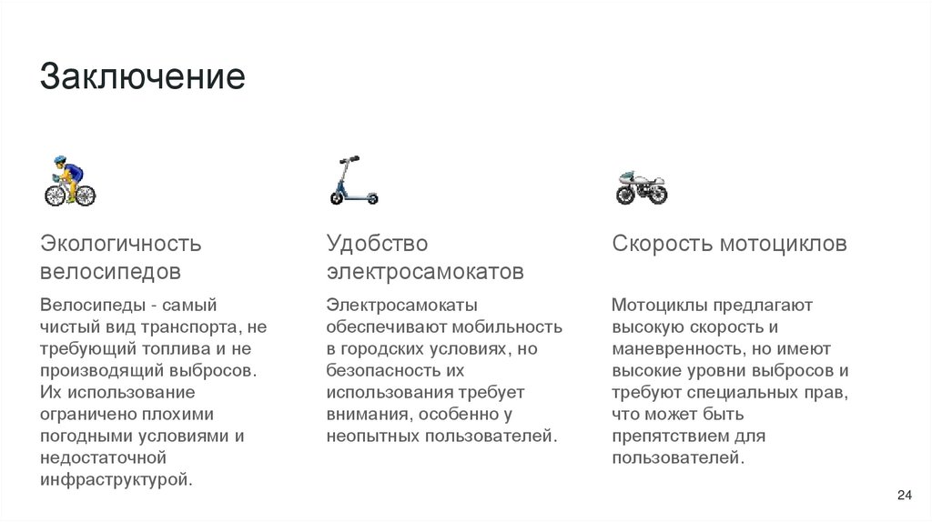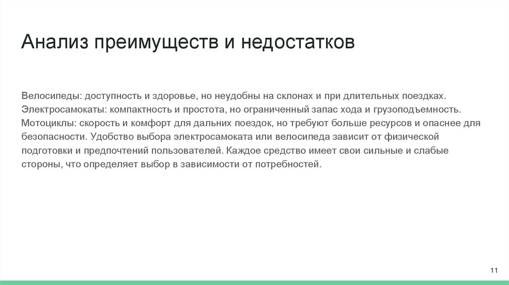 Анализ преимуществ и недостатковВелосипеды: доступность и здоровье, но неудобны на склонах и при длительных поездках.