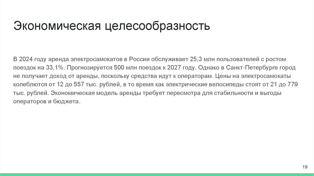 Экономическая целесообразностьВ 2024 году аренда электросамокатов в России обслуживает 25,3 млн пользователей с ростом