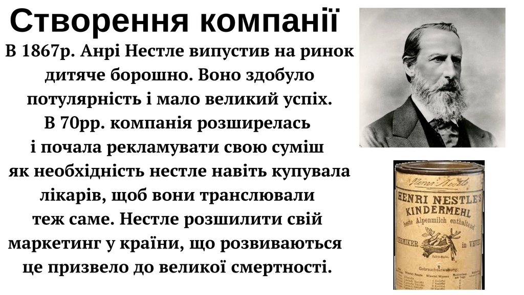 Створення компаніїВ 1867р. Анрі Нестле випустив на ринок