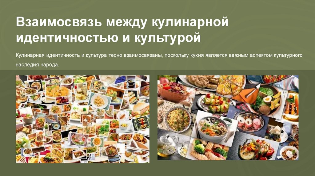 Кулинарная идентичность и культура тесно взаимосвязаны, поскольку кухня является важным аспектом культурного