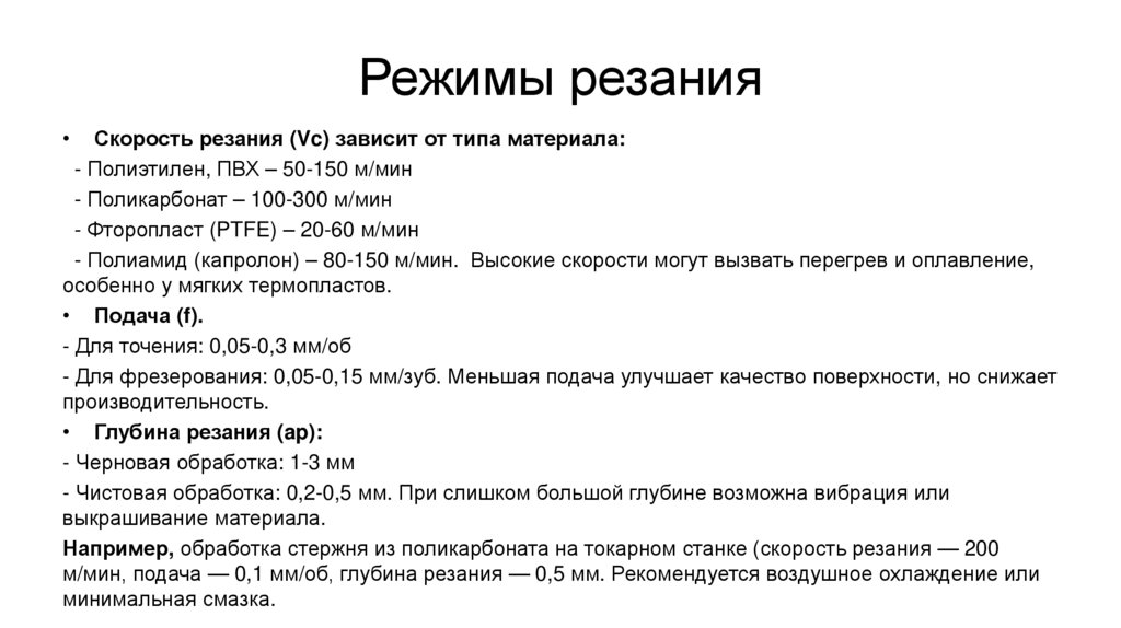 Режимы резанияСкорость резания (Vc) зависит от типа материала: