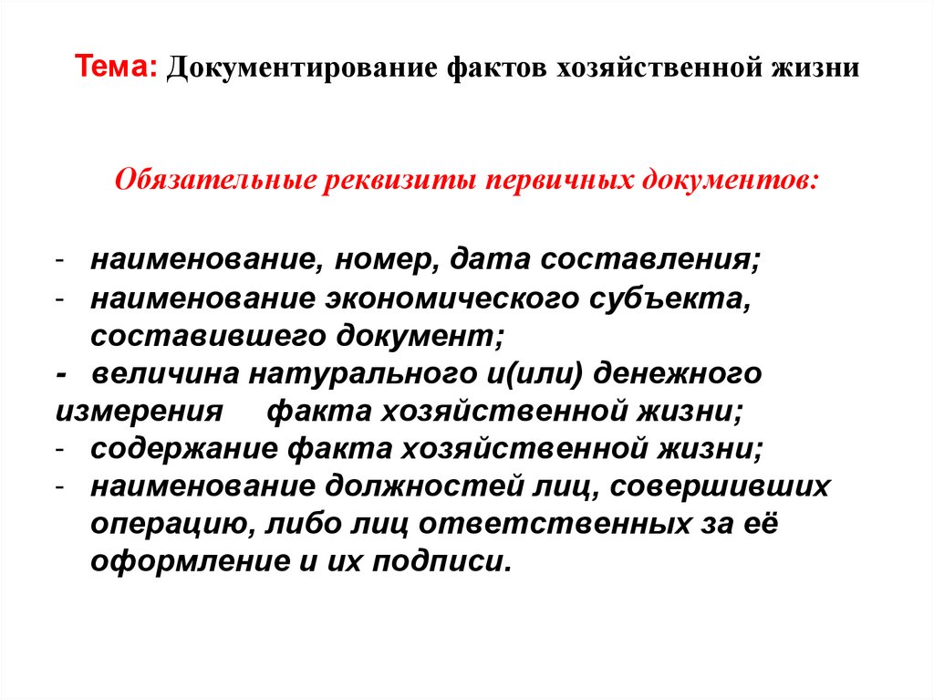 Тема: Документирование фактов хозяйственной жизниОбязательные реквизиты первичных документов: