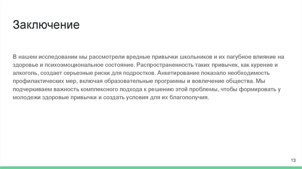 ЗаключениеВ нашем исследовании мы рассмотрели вредные привычки школьников и их пагубное влияние на