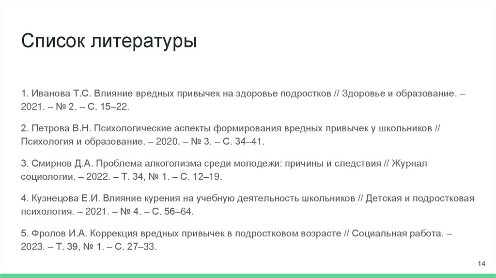 Список литературы1. Иванова Т.С. Влияние вредных привычек на здоровье подростков // Здоровье и образование. –