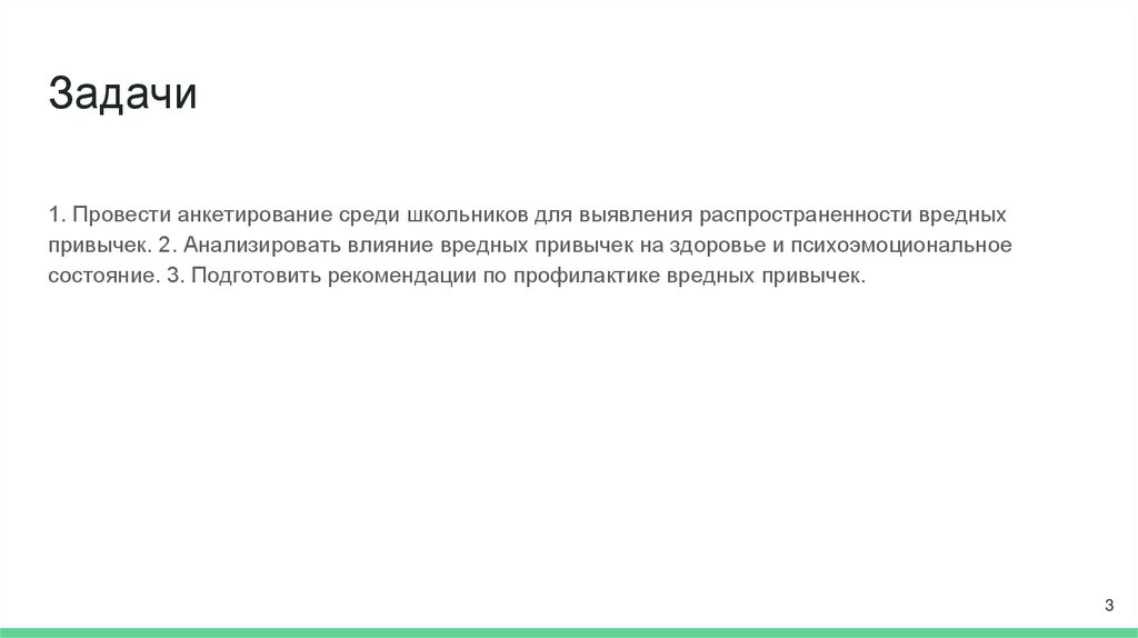 Задачи1. Провести анкетирование среди школьников для выявления распространенности вредных