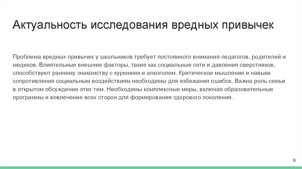 Актуальность исследования вредных привычекПроблема вредных привычек у школьников требует постоянного внимания педагогов, родителей и