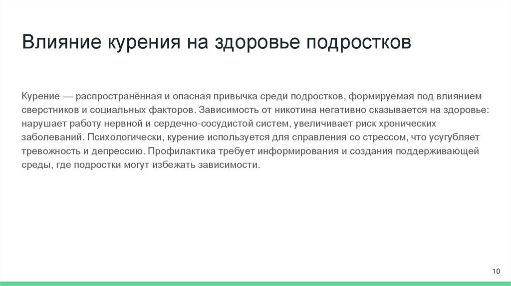 Влияние курения на здоровье подростковКурение — распространённая и опасная привычка среди подростков, формируемая под влиянием
