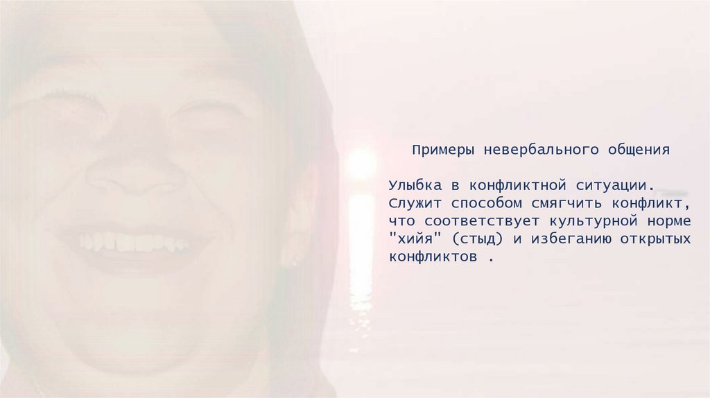 Примеры невербального общенияУлыбка в конфликтной ситуации.