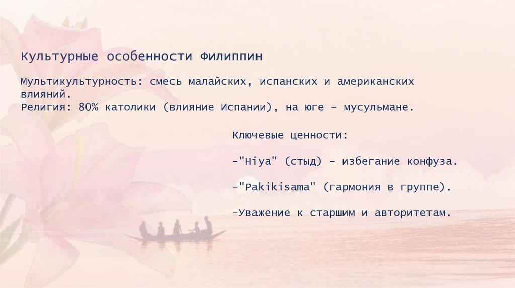 Культурные особенности ФилиппинМультикультурность: смесь малайских, испанских и американских