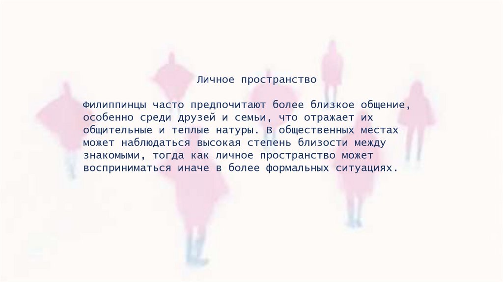 Личное пространствоФилиппинцы часто предпочитают более близкое общение,