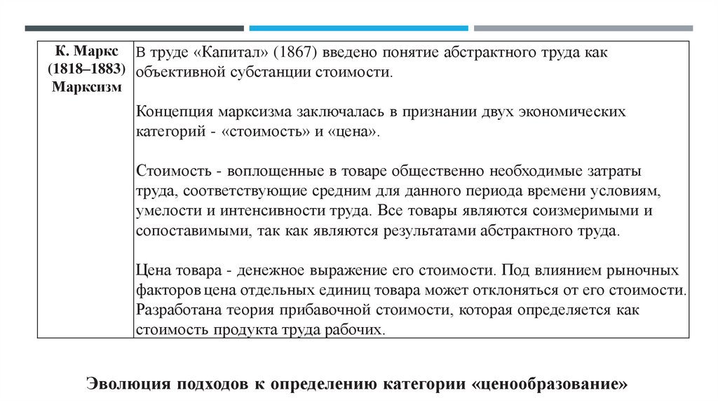 К. Маркс В труде «Капитал» (1867) введено понятие абстрактного труда как(1818–1883) объективной субстанции стоимости.