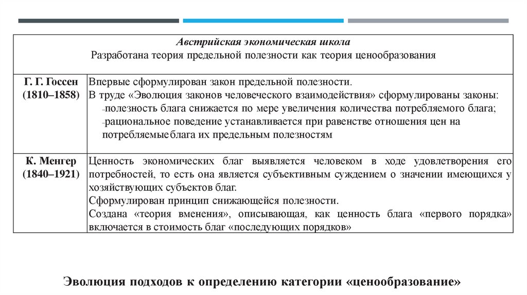 Австрийская экономическая школаРазработана теория предельной полезности как теория ценообразования