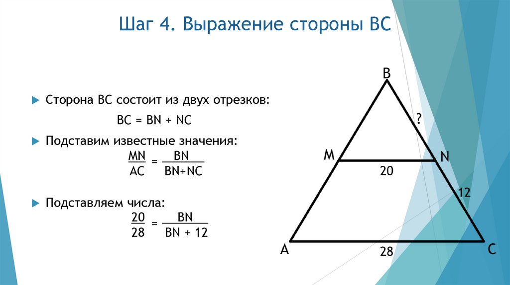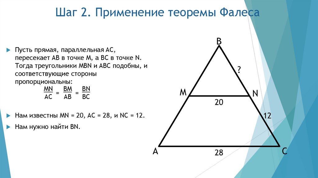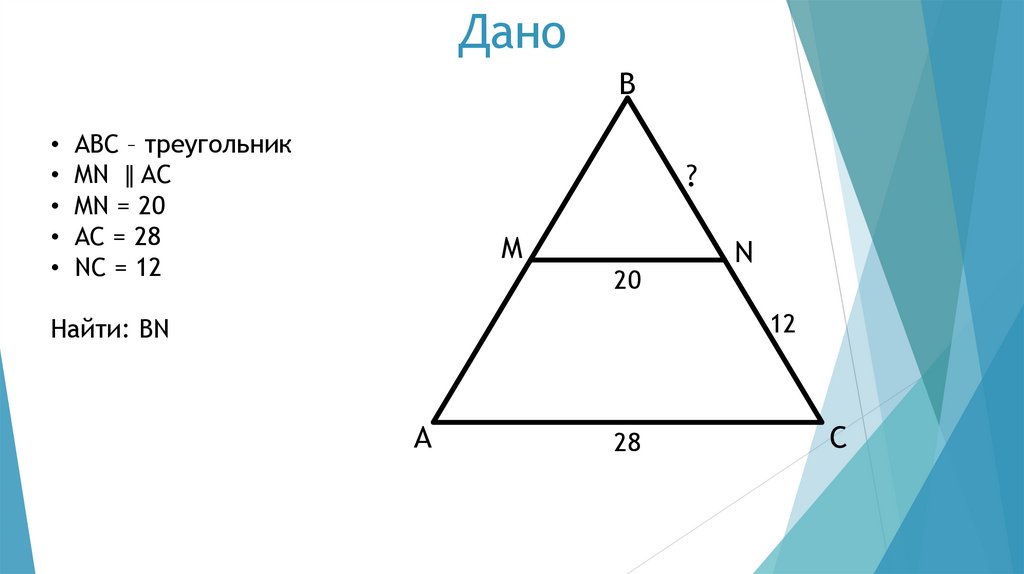 Нам известны MN = 20, AC = 28, и NC = 12.