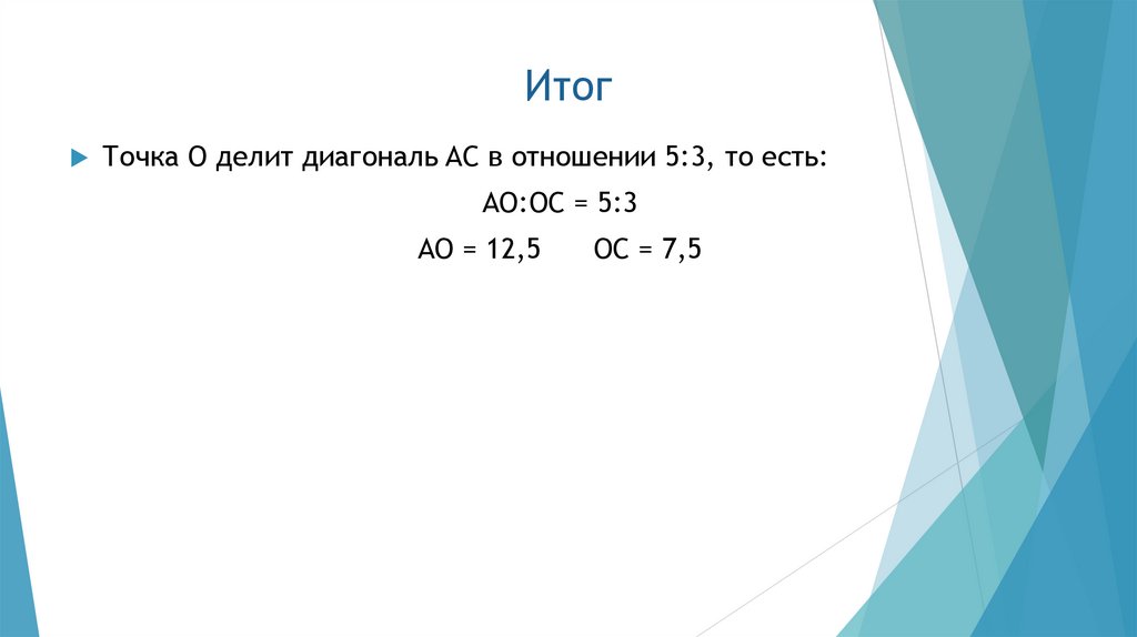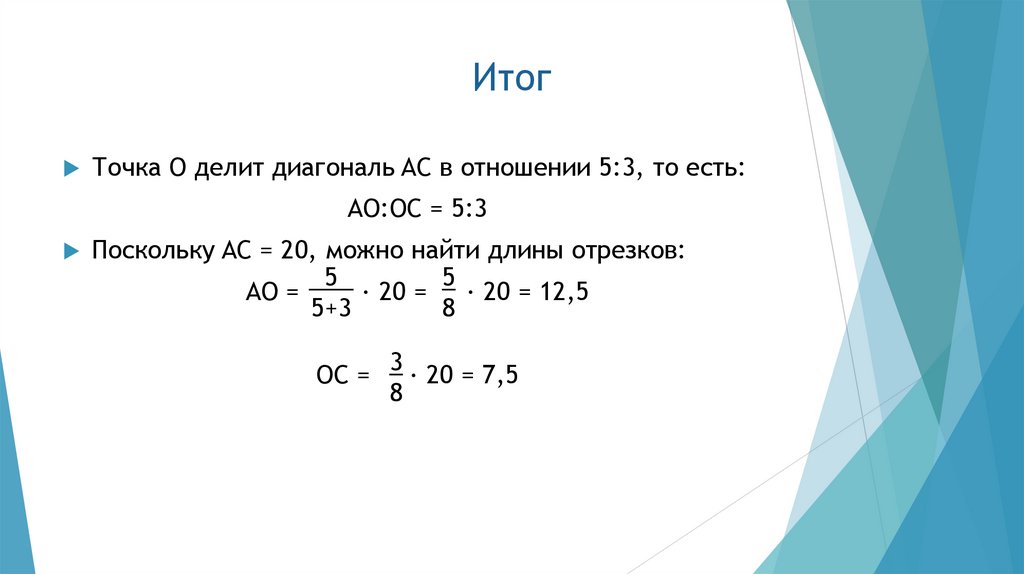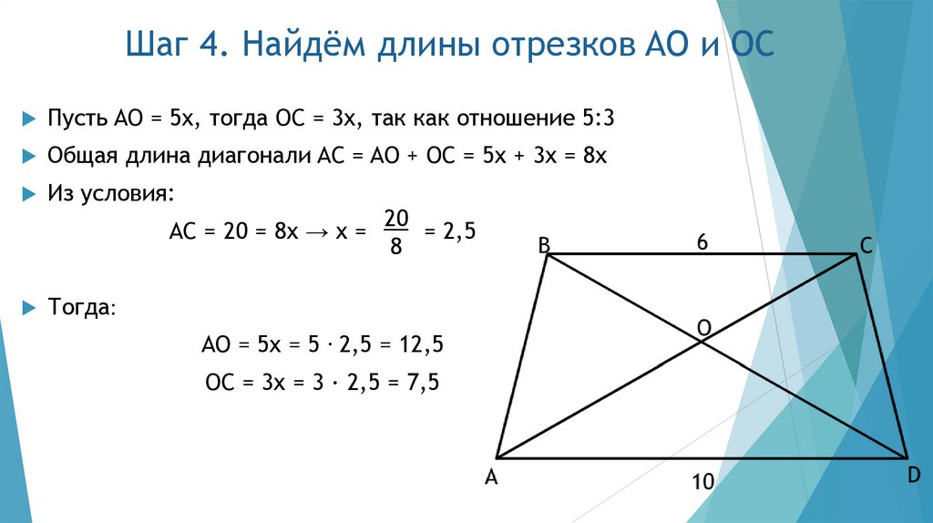 Пусть AO = 5x, тогда OC = 3x, так как отношение 5:3Общая длина диагонали AC = AO + OC = 5x + 3x = 8x
