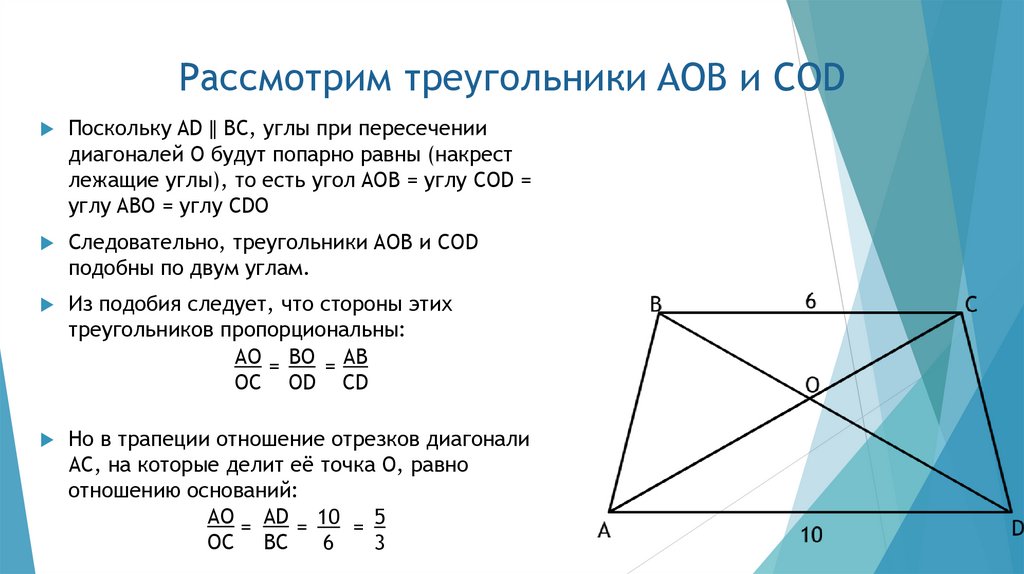 Поскольку AD ǁ BC, углы при пересечениидиагоналей O будут попарно равны (накрест
