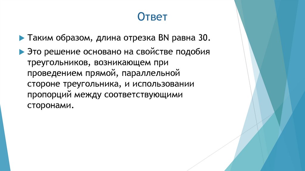 Таким образом, длина отрезка BN равна 30.Это решение основано на свойстве подобия
