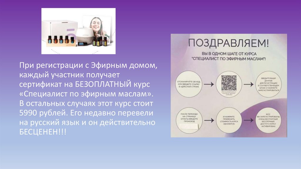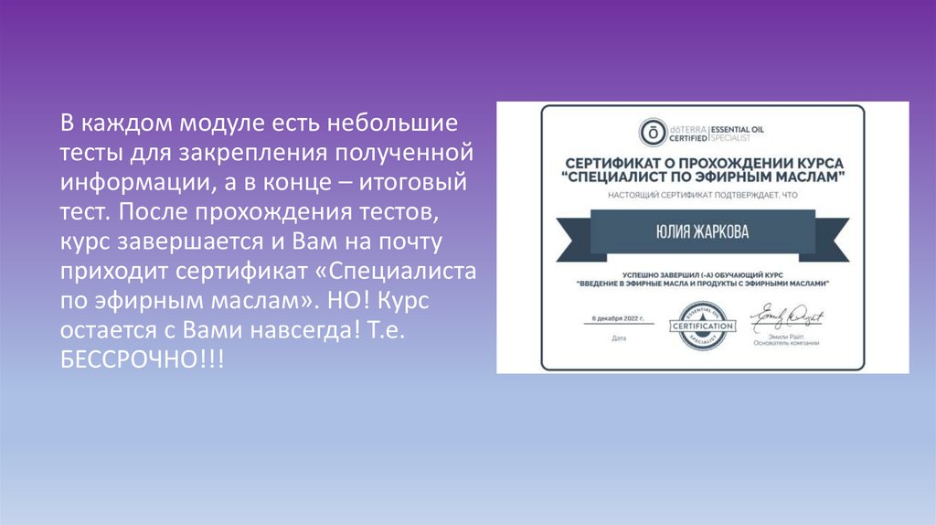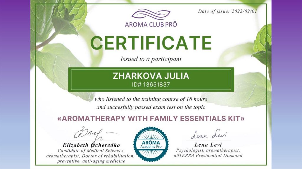 К концу обучения вы станете сертифицированным специалистом по эфирным маслам dōTERRA, сможете