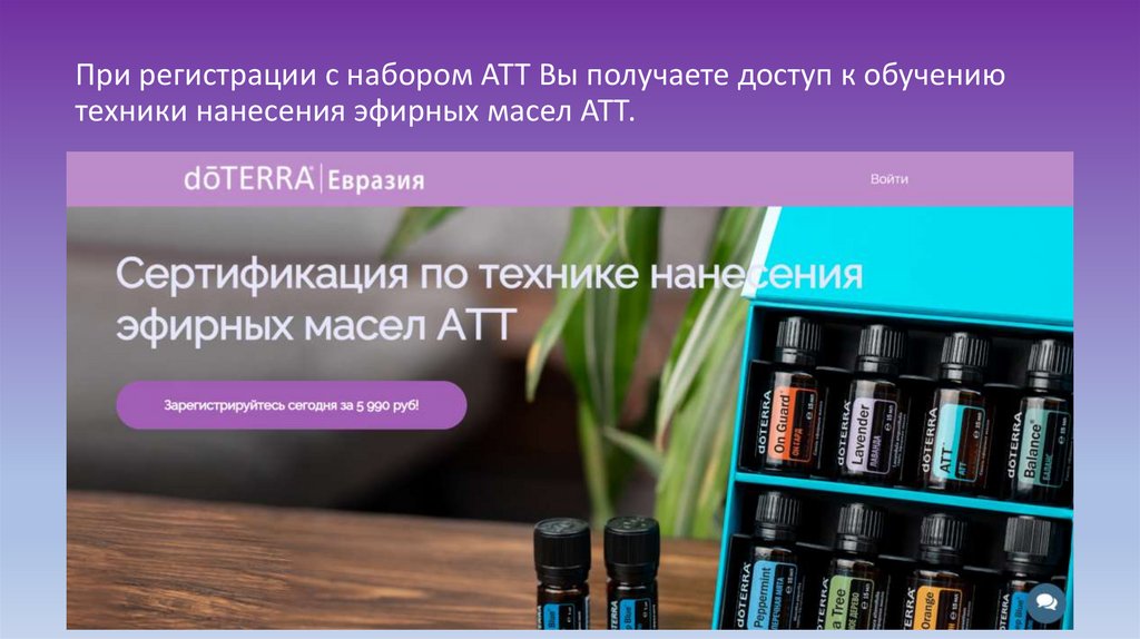 При регистрации с набором АТТ Вы получаете доступ к обучениютехники нанесения эфирных масел АТТ.