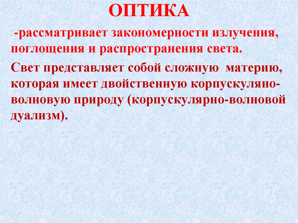 -рассматривает закономерности излучения,поглощения и распространения света.