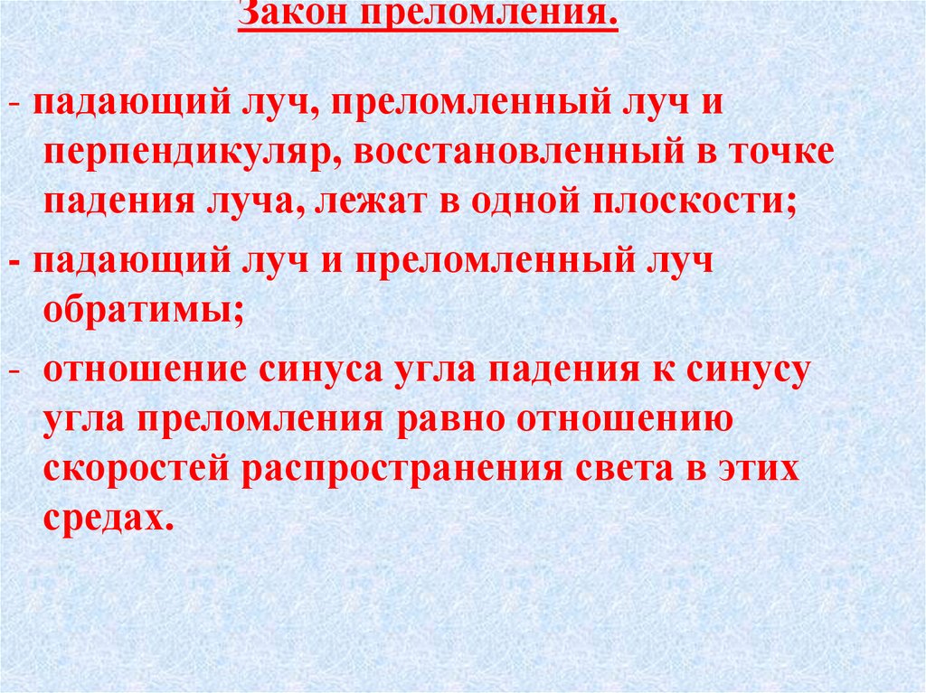 - падающий луч, преломленный луч иперпендикуляр, восстановленный в точке