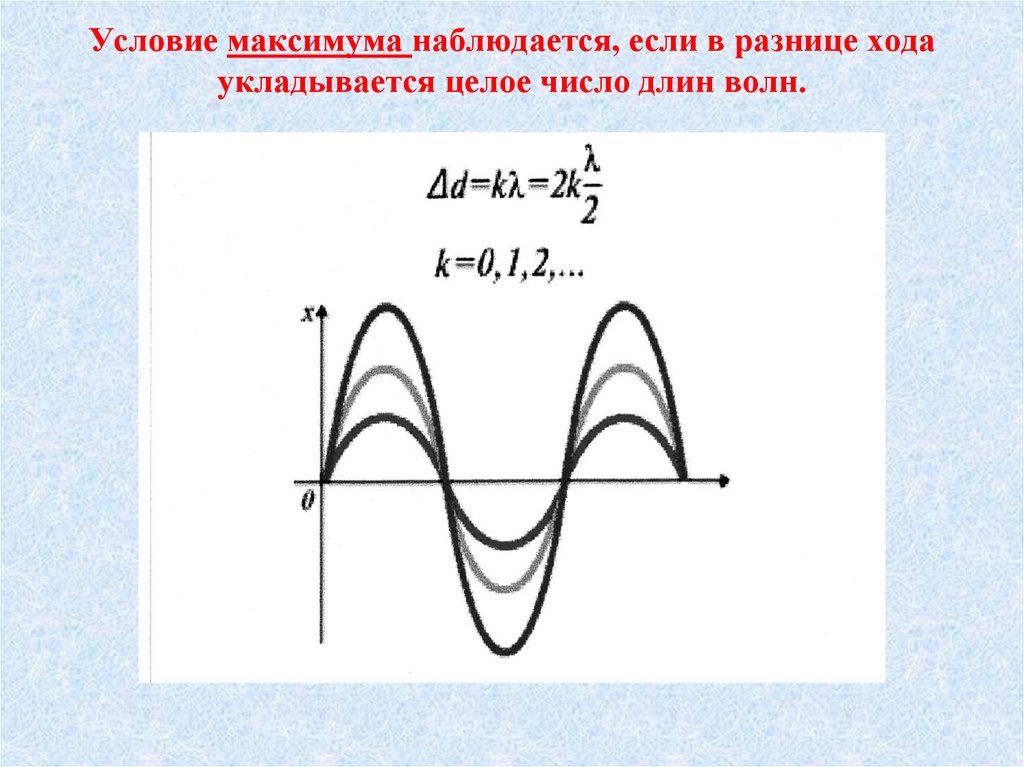 30. Условие максимума наблюдается, если в разнице хода укладывается целое число длин волн.