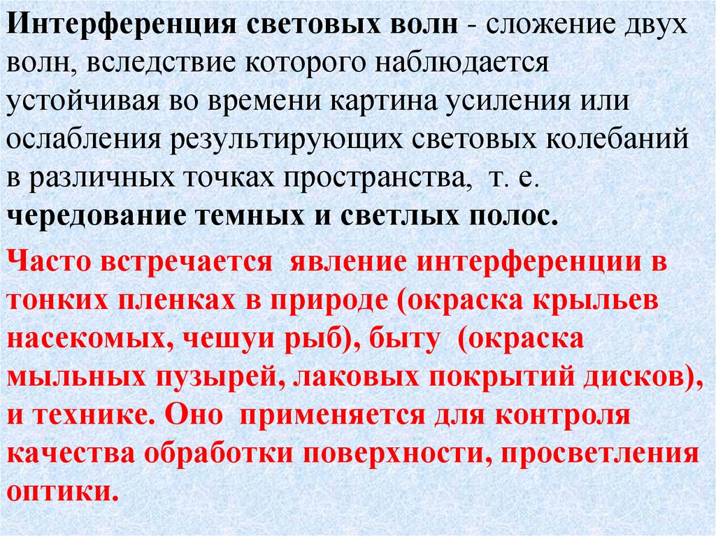Интерференция световых волн - сложение двухволн, вследствие которого наблюдается