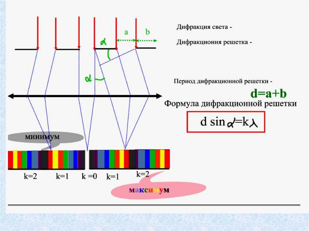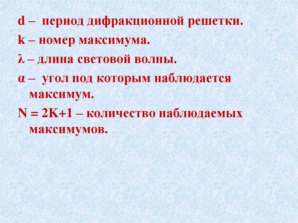d – период дифракционной решетки.k – номер максимума.