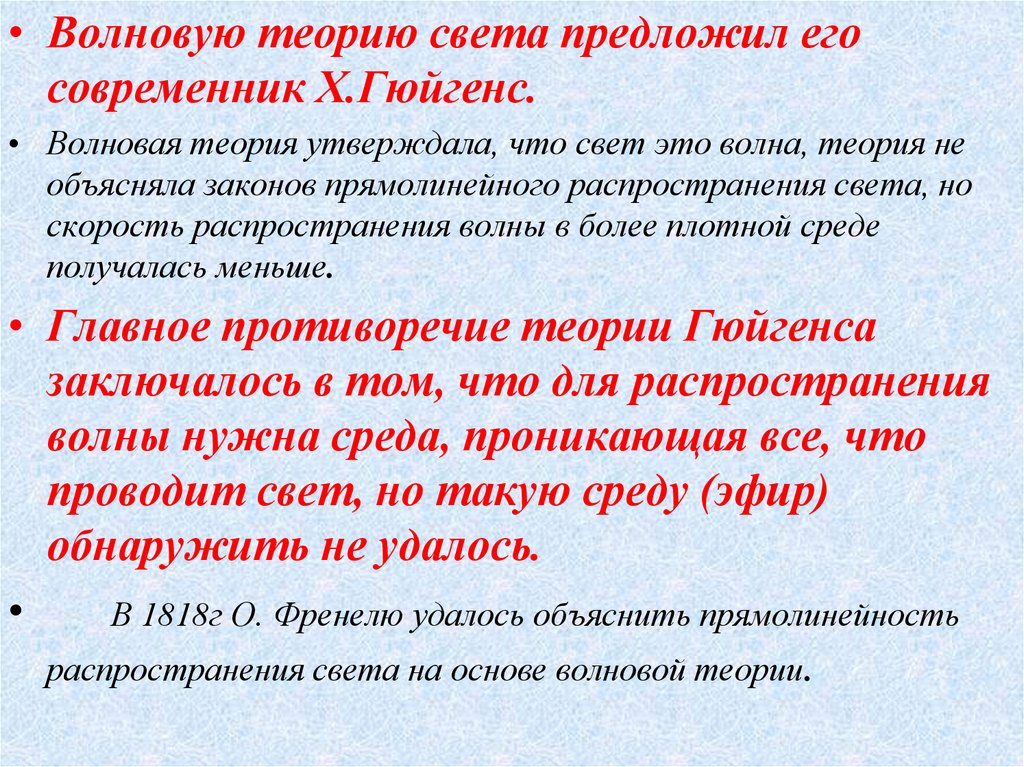 • Волновую теорию света предложил егосовременник Х.Гюйгенс.