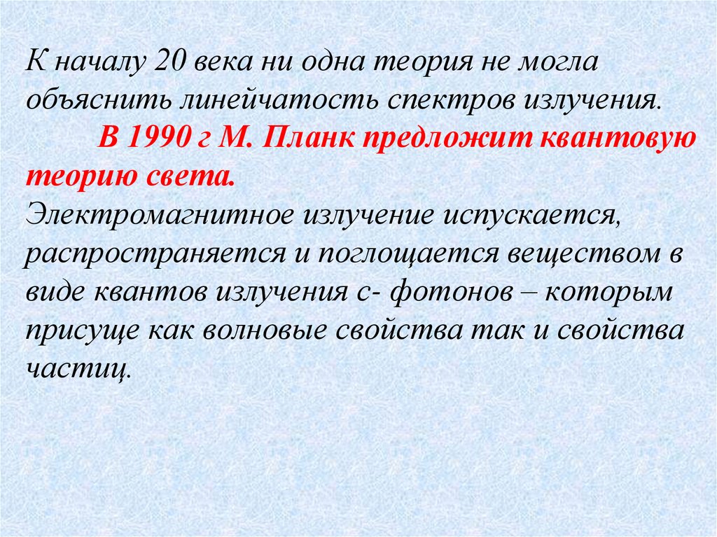 7. К началу 20 века ни одна теория не могла объяснить линейчатость спектров излучения. В 1990 г М. Планк предложит квантовую