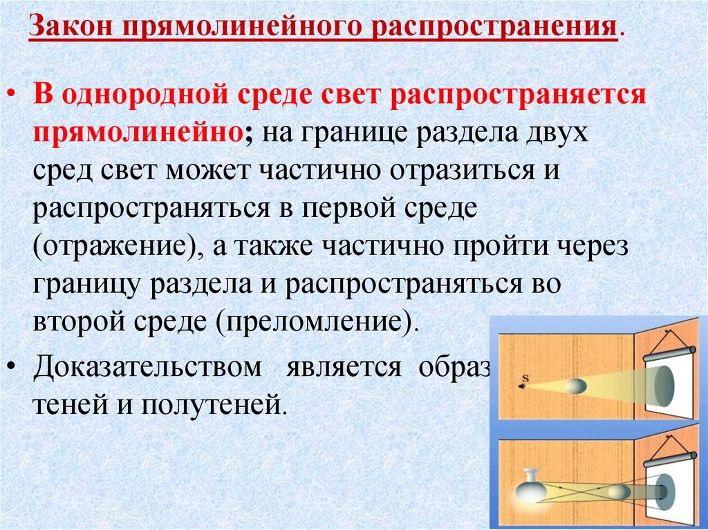• В однородной среде свет распространяетсяпрямолинейно; на границе раздела двух