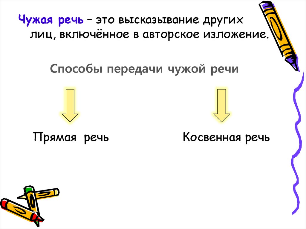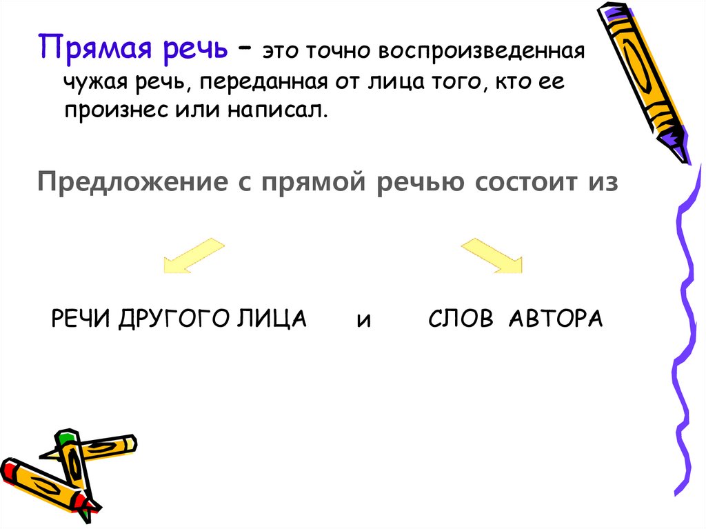 Прямая речь – это точно воспроизведеннаячужая речь, переданная от лица того, кто ее