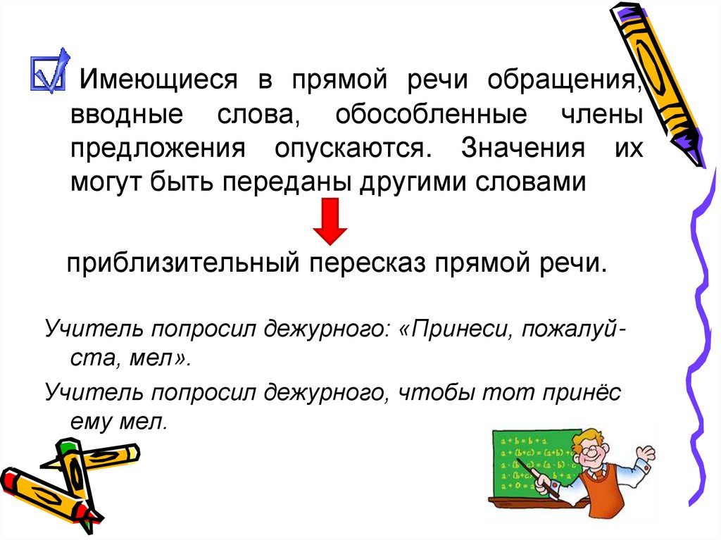 Имеющиеся в прямой речи обращения,вводные слова, обособленные члены