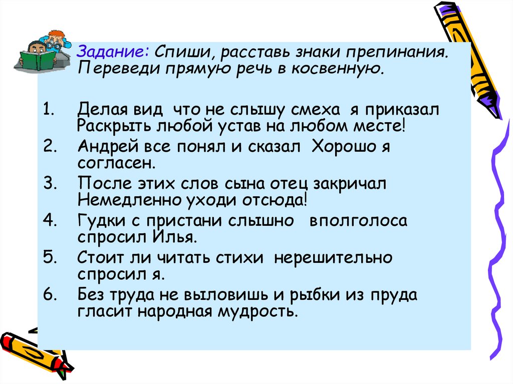 Задание: Спиши, расставь знаки препинания.Переведи прямую речь в косвенную.